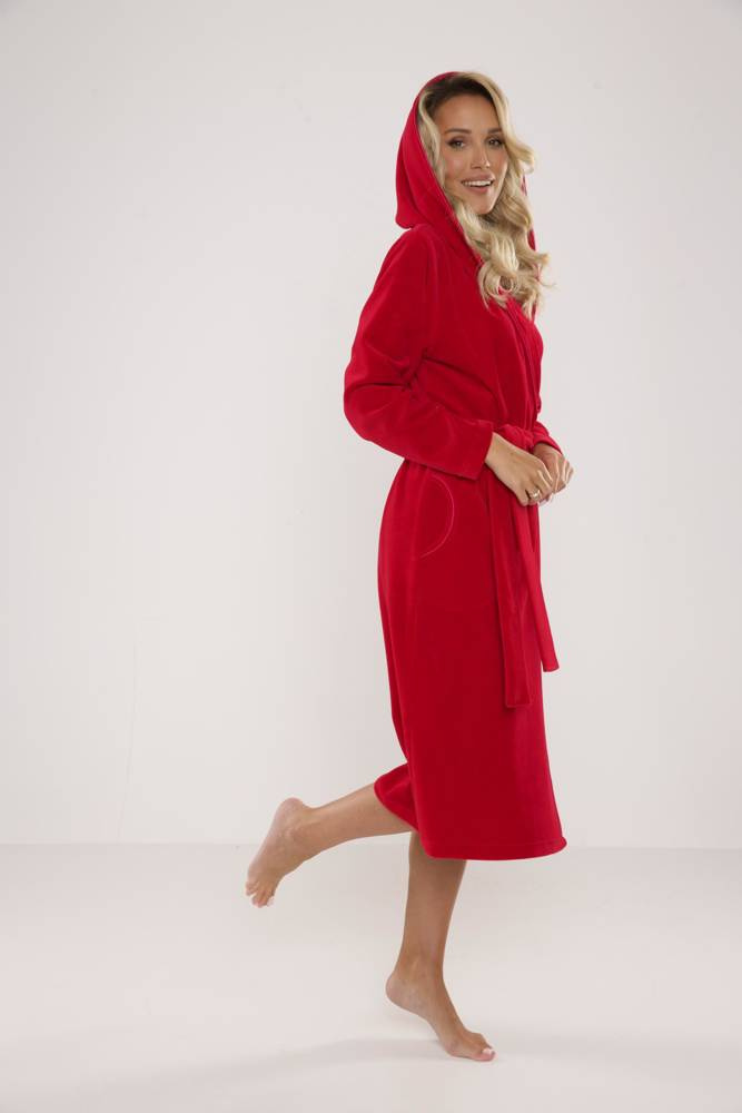 Дамски халат с качулка. Джобове отстрани. Кройка на плик с каишка за перфектно прилягане. Модел, изработен от фин памук. Халатът се съчетава перфектно с риза или пижама, налични в колекцията ни с нощни дрехи. В халат можете да впечатлите и да заслепите с красотата си, дори и да ходите само в спалнята с него.