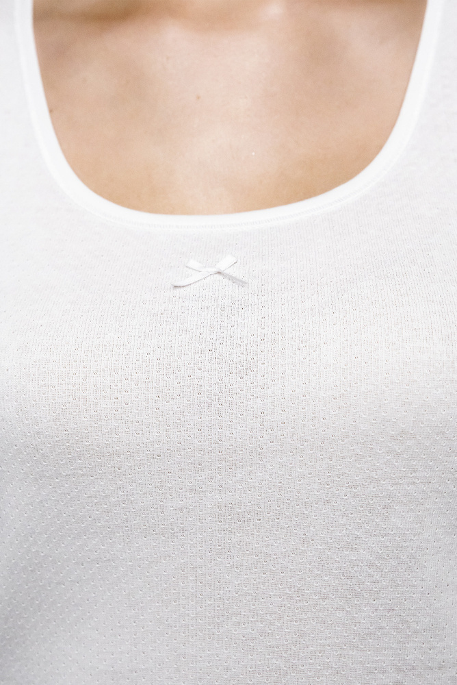 Класическата рокличка Debi със сатенена панделка е идеалният избор за тези, които ценят високото качество на изработка. При избора на тази дреха приятната и дишаща материя е от първостепенно значение, поради което тениската Debi е изработена от чист памук. Антиалергичната и мека на допир материя и широките презрамки ще увеличат комфорта ви и ще направят бельото незабележимо дори по време на интензивни упражнения. Фокусираме се върху вашия комфорт, така че можете да сте сигурни, че кожата ви ще бъде перфектно защитена от студа и грубата текстура на връхните дрехи. Деликатната декорация под формата на сатенена панделка придава на ризата елегантен и изискан вид. Това фино допълнение означава, че тениската ще изглежда еднакво добре и като открита част от стила.