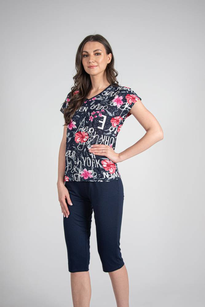 Пижама от две части на De lafense, изработена от висококачествена вискоза. Идеален за добър сън през нощта и чудесно начало на деня с първото сутрешно кафе. Тениска с къс ръкав, шарена. Униформен панталон 3/4.