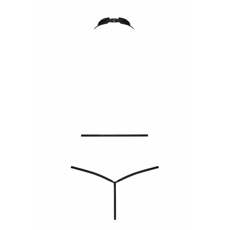 Oryginalne body zapinane na szyje z ozdobnymi łączeniami w kształcie kółek i paseczkami przylegającymi do ciała, wykonane z czarnej skóry.