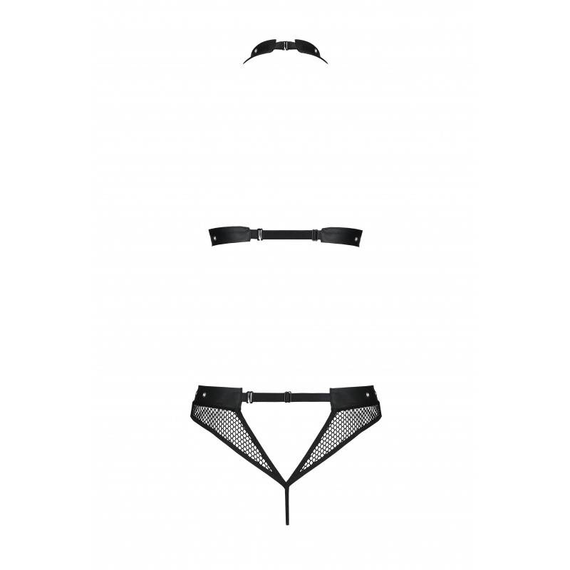 Zmysłowa siateczka przysłaniająca kobiece walory, skórzane wstawki, ozdobne napy, zapinanie na szyje to komplet Moonlight. Idealne propozycja od marki Passion na romantyczne wieczory przy świetle księżyca.