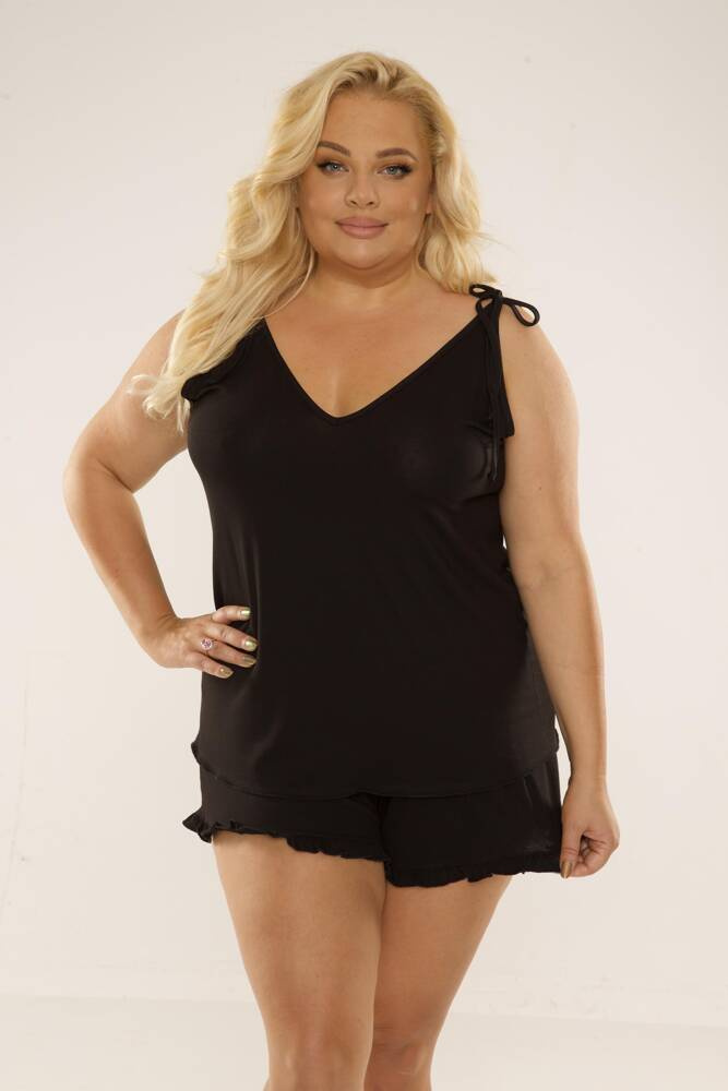 Пижама от две части на De lafense, изработена от висококачествена вискоза. Идеален за добър сън през нощта и чудесно начало на деня с първото сутрешно кафе. Тениска с тънки презрамки и декоративни връзки на раменете. V-образно деколте и гръб. Къси панталони - крачолите завършват с ресни.