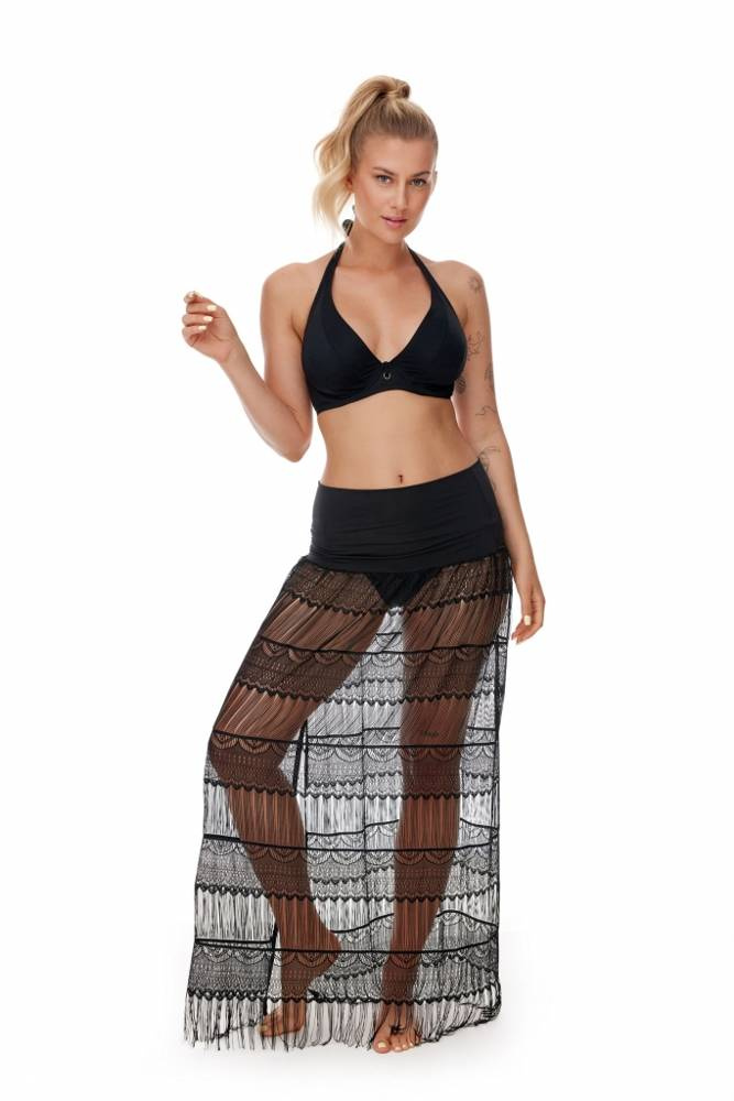 Черно плажно парео под формата на туника в бохо стил. Еластична горна част с деколте бандероли. Част от полата от прозрачна дантела с кокетно изрязване и завършваща с пискюли. Може да се носи по два начина - като рокля или като пола. Идеален за плажа и като допълнение към летния тоалет.