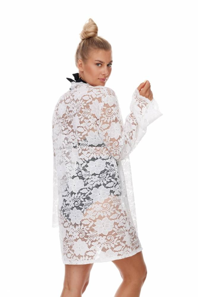 Елегантен бял халат във формата на пареа. Разширени ръкави, завързани на талията. Перфектният избор за допълване на плажния стил.