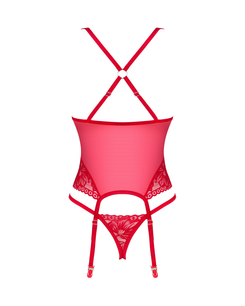 Elegancki gorset damski z miękkimi miseczkami z fiszbinami. Całość wykonana z miękkiej koronki i elastycznej siateczki. Paski do pończoch nieodpinane z regulacją. Do kompletu stringi. Pończochy nie są w zestawie.